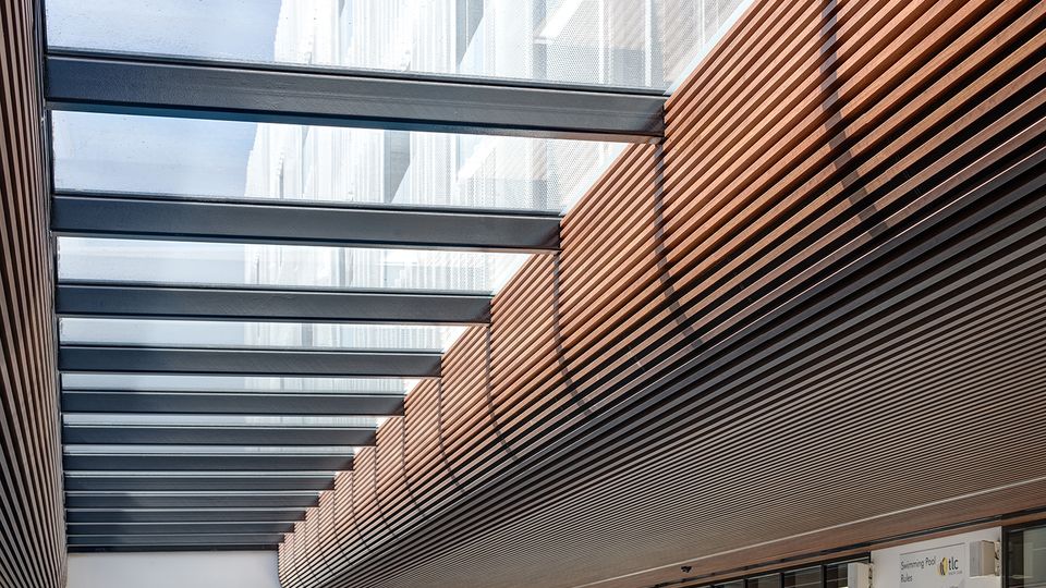 - We executed the first ‘rotational twist’ application of the Sculptform timber-look battens to create the curved walls at each entrance. This project was a pioneering example of using this method to create complex curves.